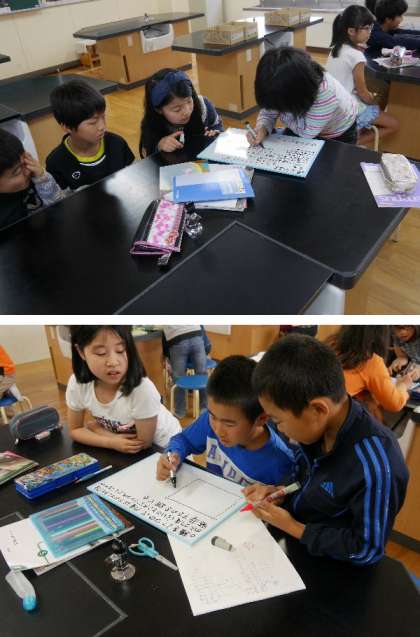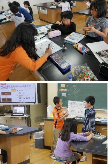 5年生の理科の授業です。種子が発芽するにはどんな条件が必要なのかを班で考えました。ホワイトボードを使って皆で考えて、班で発表をしていました。ホワイトボードはすべての学級に用意してあり、授業の内容によって各学級で活用しています。