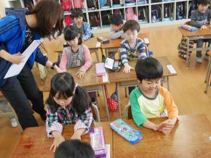 1年生で清潔検査がおこなわれていました。ハンカチ、チリガミ持ってるかな?つめはきれいに切れているかな?毎月、不定期に5回の検査を行っています。