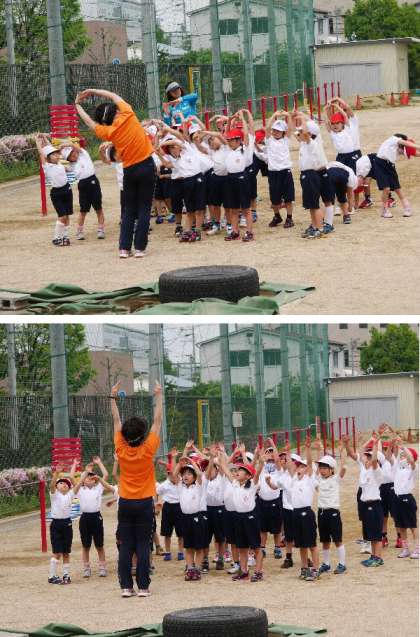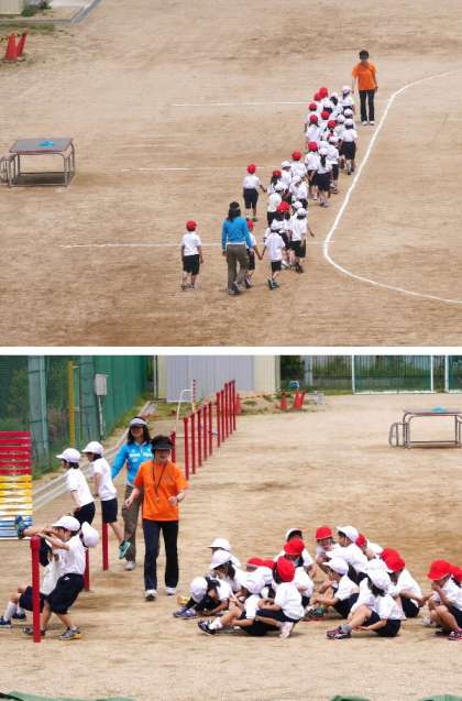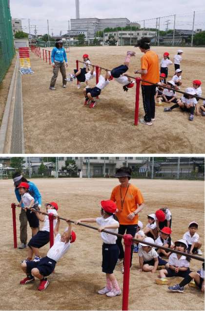 1年生が運動場で体育の授業をしていました。鉄棒で前まわりの練習です。子どもたちは「楽しい」といきいきしていました。元気よく運動していこうね。
