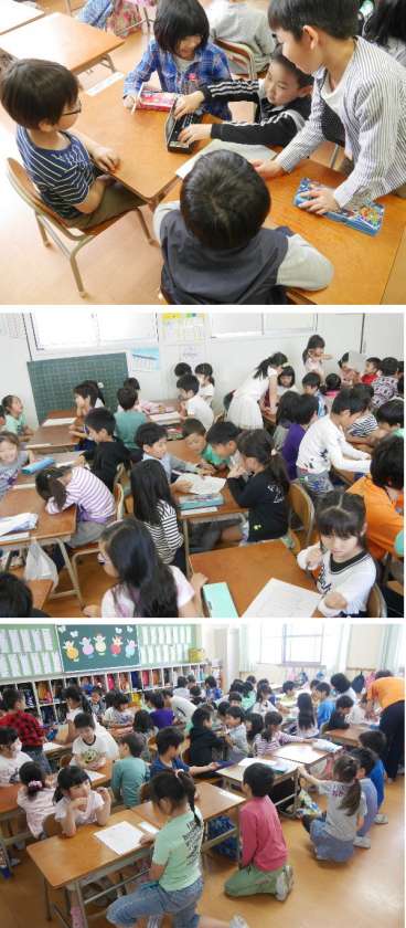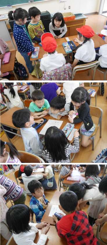 2年生が1年生の教室にきていました。明日は2年生が1年生をつれて、校内を探検しまします。今日は、班で打ち合わせです。楽しみですね。2年生はやさしく1年生に説明できていましたね。よろしくお願いいたします。