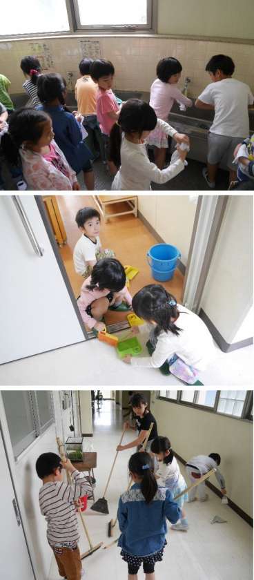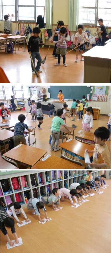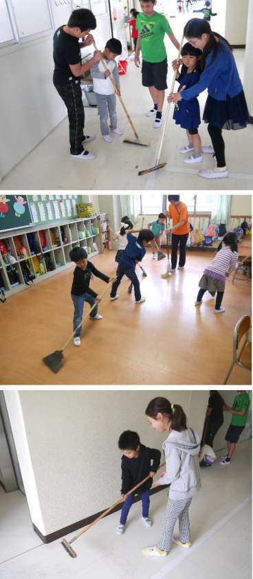 今日から1年生は教室のそうじを自分たちでしていきます。6年生のおにいさん、おねえさんが来てくれて、掃除のお手伝いや掃除の仕方を教えてくれています。まだ、ほうきの持ち方がぎこちないかな?毎日、全員で掃除するからね。小さなほうきで溝をはく人もいます。ぞうきんがけも楽しそうです。