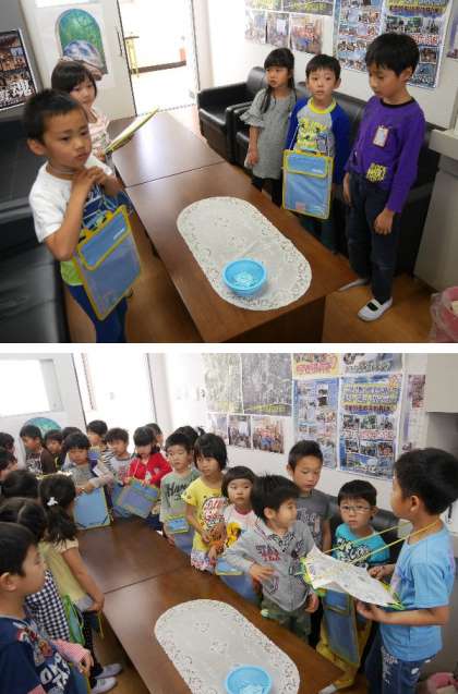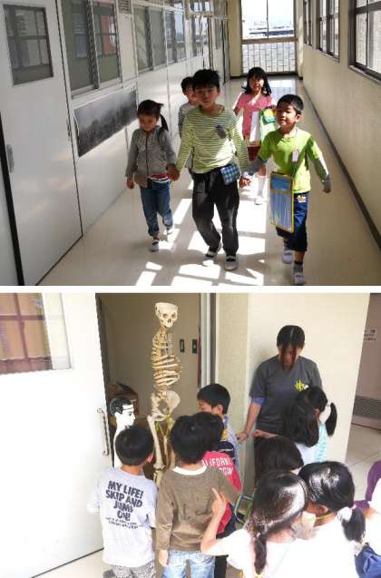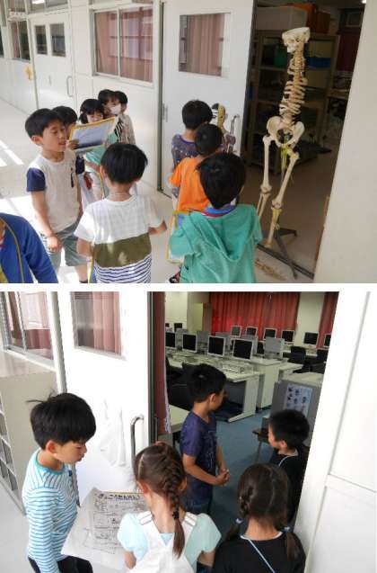 2年生が1年生を案内しての学校探検です。校長室では何の部屋かを一生懸命に2年生かが説明してくれていました。校長室に入るときには「しつれいします」と、1年生にマナーも教えてくれていました。たのもしいですね。各部屋には部屋名のカードがもらえます。集めたカードを用紙にはりつけて学校探検のまとめをつくります。理科室には、やっぱりあのガイコツが待っていてくれていましたね。