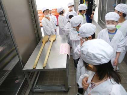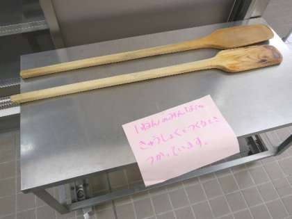 1年生のために、給食調理員さんが、給食をつくるときに使う大きなへらを置いてくれていました。こんな大きなものでつくっているんですね。知らなかったですね。
