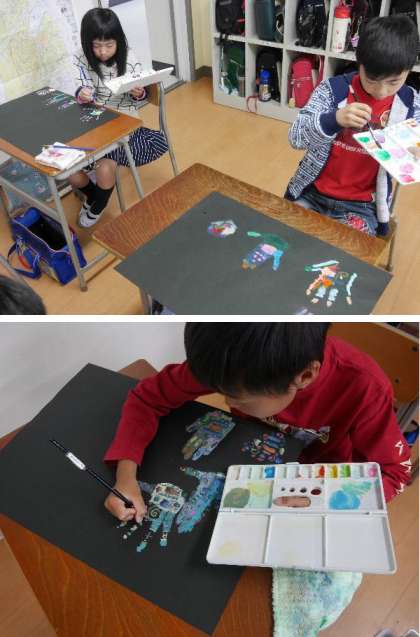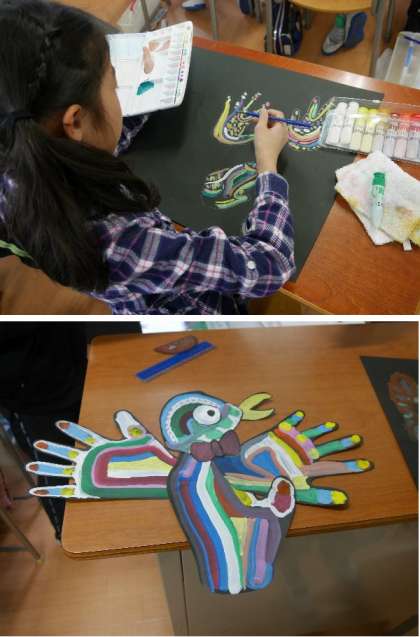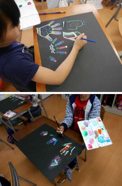 4年生が自分の手の形をいろいろな色でデザインしています。最後に切り抜いて、鳥の形になるそうです。色とりどりです。