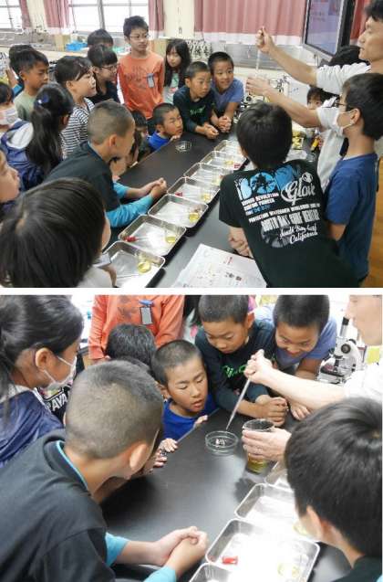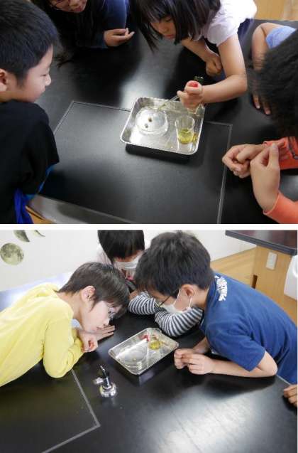 5年生の理科の実験です。ヨウ素液を切断したインゲン豆にかけて色が変化するのかみています。色が青紫に変わるとでんぷんがある証拠なんです。種子は肥料をあたえなくても発芽しました。発芽に必要な養分はどこにあるのか調べています。