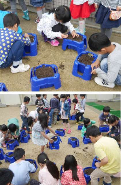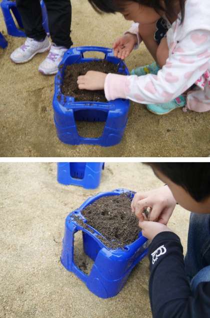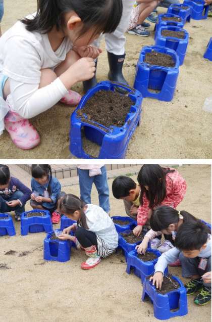 1年生のあさがおのタネまきをしています。学習園で土をいれてもらって、指で5つ穴をあけて、一つづつタネを植えました。最後に肥料をのせて完成です。今日は雨天なので水やりをしなくても大丈夫です。大きく生育してどんなあさがおの花が咲くか楽しみですね。