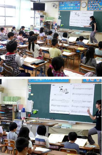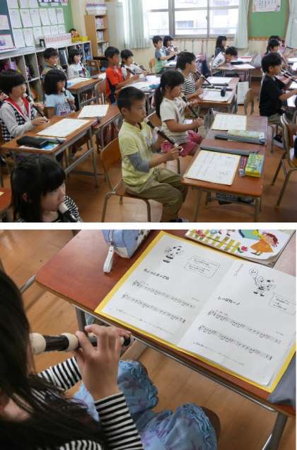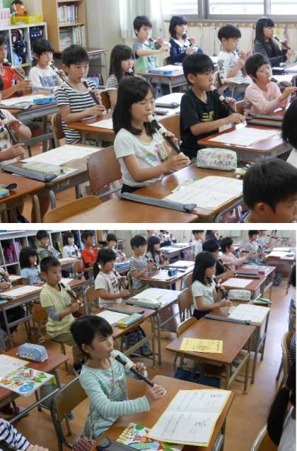 3年生から始まるリコーダの練習です。楽譜をみながら、姿勢をただして、一つの音を音符にあわせてふいています。いろいろな曲が早くふけるようになると楽しいですね。