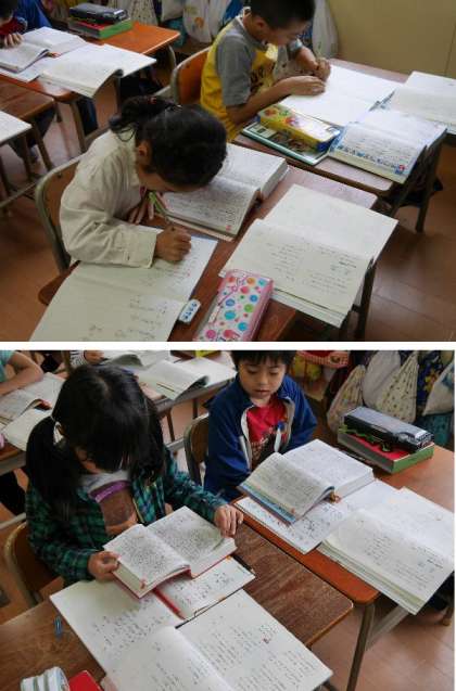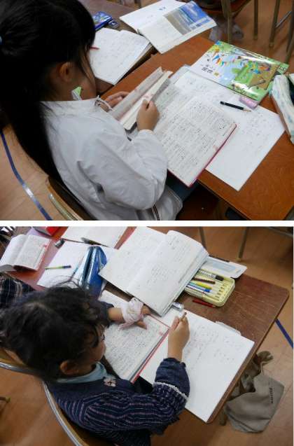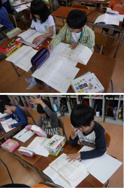 3年生が辞書をもって、いろいろな言葉を調べています。ふだん使っている話言葉では、調べることができない場合もありますね。言葉の語尾が形をかえる言葉を調べてみました。
