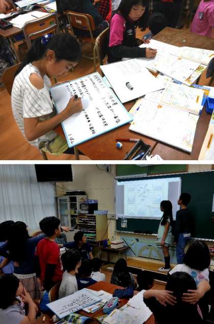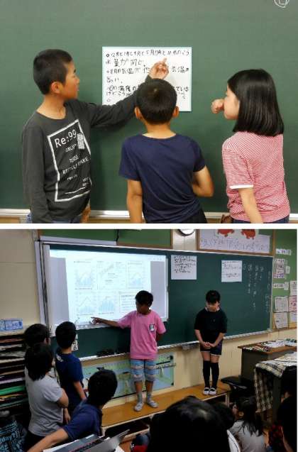 5年の社会科では、日本各地の気候のちがいを学習しています。各地の年間気温と降水量からわかることを各班で話し合って、ホワイトボードと教科書を拡大投影した資料で子どもたちが説明しています。自分たちで考えるっておもしろいね。