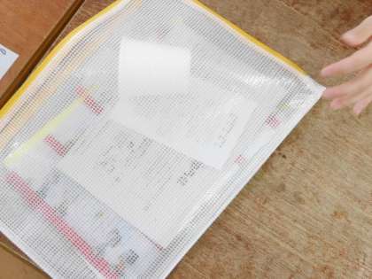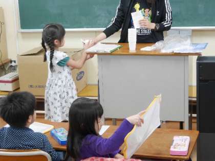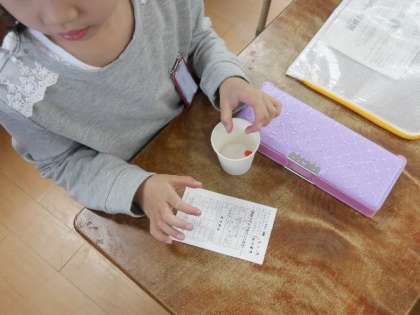 1年生で検尿の容器と袋を渡しています。明日と明後日の2日間で検尿検査を行います。朝起きて採尿することをわすれないでくださいね。