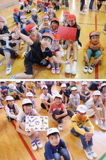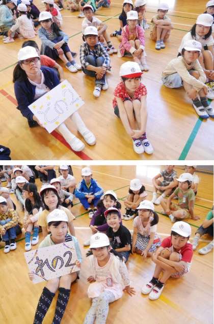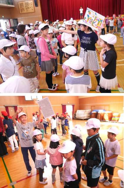 今日の児童集会は、先週の顔あわせの時に練習したように、たてわり班で集まって座ります。たてわり班のカードを掲げて、ファミリーが集まります。全員の確認ができたら班でまとまって座ります。