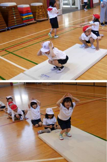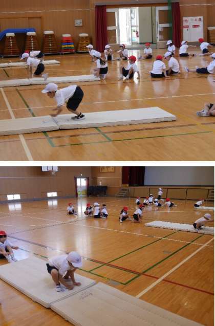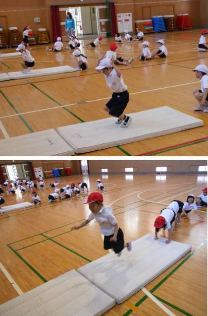1年生の体育の授業です。マットをひろげて、とんだりはねたりと運動しています。うさぎさんのように跳んだり、かえるさんのようにぴょんぴょんと跳んだり、いろいろな動きで遊びながら、少しずつ体力がついていきますね。