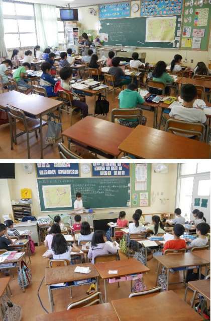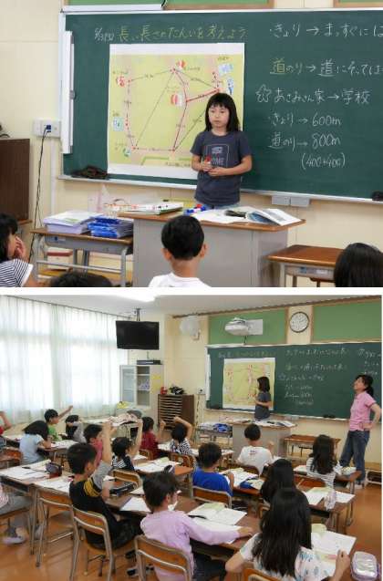 3年生では習熟度別少人数授業を行っています。2クラスを3クラスに分けて、少人数で算数の授業をしています。拡大カラー用紙をもちいて、わかりやすい授業になるように取り組んでいます。