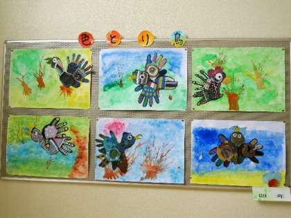 4年の掲示板に、図工で作った「色とり鳥」が掲示されました。カラフルで楽しい絵になりましたね。