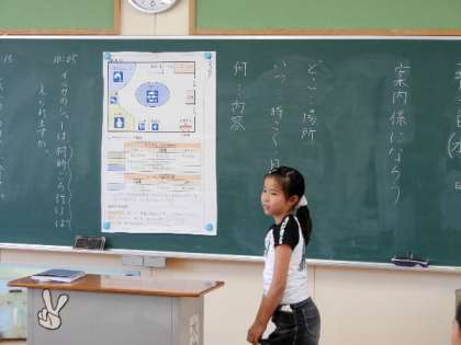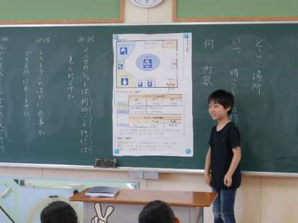 水族館の案内係用資料をみて、ショーや館内食事の案内がじょうずにできるかな。たくさんのデータを読み取って、わかりやすく伝えるってとても大切なことですね。しっかりと練習しよう。