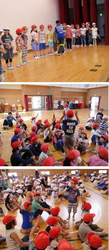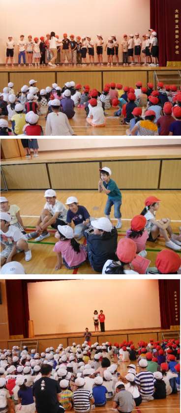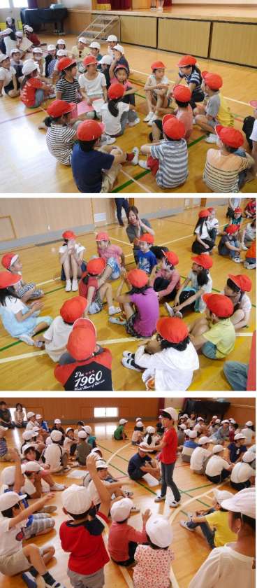今日は児童集会の日です。6年リーダがたてわり班を上手にまとめています。児童集会のクイズは、各たてわり班から順番に代表1人ずつでてきて、ジェスチャー問題が与えられます。班にもどってジェスチャをして班で答えあいます。だんだんとアットホームな班になってきて、とても楽しそうでした。