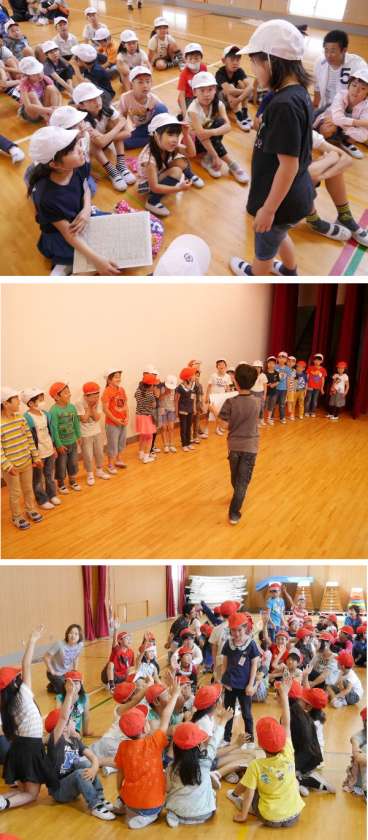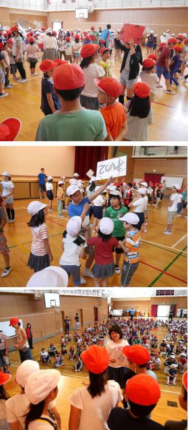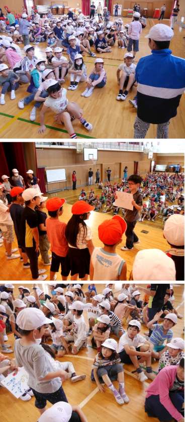 今日の児童集会は、集会委員からのクイズですが、各たてわり班の代表一人に問題がだされ、それを各班に持ち帰ってジェスチャーで伝えて答えます。各学年の代表が順番にでてきて、がんばっていました。