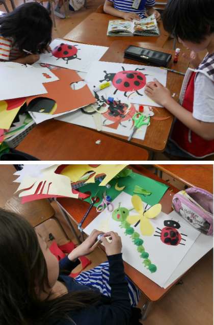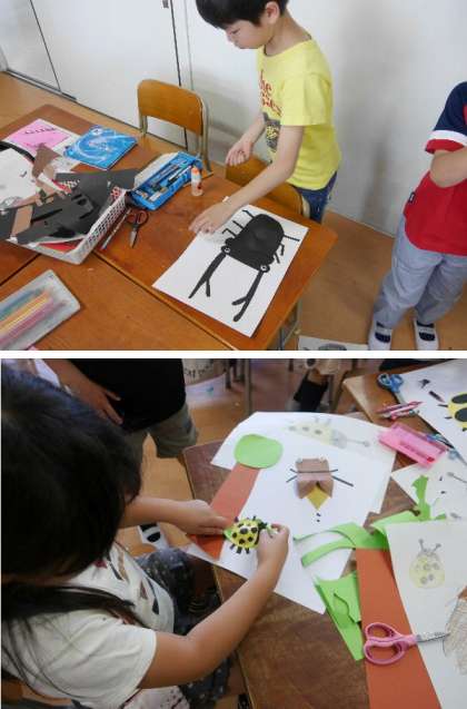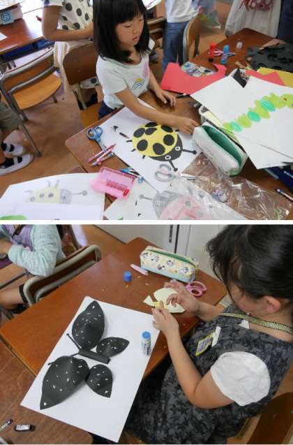 3年生が色画用紙を使って、昆虫を立体的に作っています。うまく考えていますね。