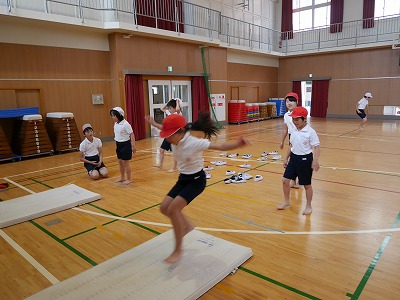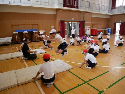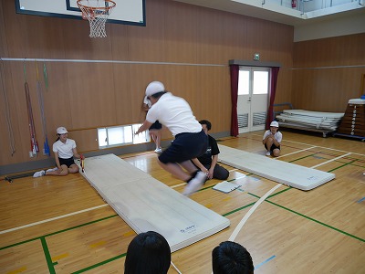 体育館の中でもテストが行われます。まずは、「立ち幅跳び」です。立ち幅跳びは両足をそろえて、踏切ラインから前方に跳躍します。最後尾の着地点を1cm刻みで計測します。2回跳んでよい方が記録となります。