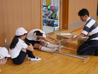 壁面に背中をつけて長座の姿勢をとり、高さ24cmの計測物を両親指の腹で押し出し、計測物の移動距離を1cm単位で計測します。2回計測してよい方が記録になります。