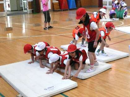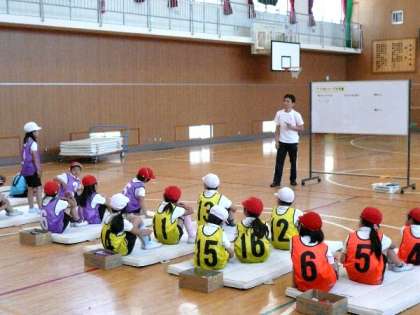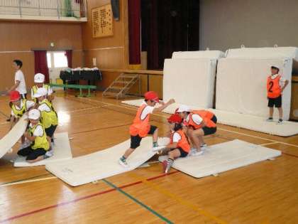 体育館前の舞台に置かれたセフティーマットがロープアイランドです。班で一畳ほどの大きさの小さなマットを二枚をうまく使って、体育館のフロアが大海の海原とみたてて、ロープアイランドを班で協力して目指します。