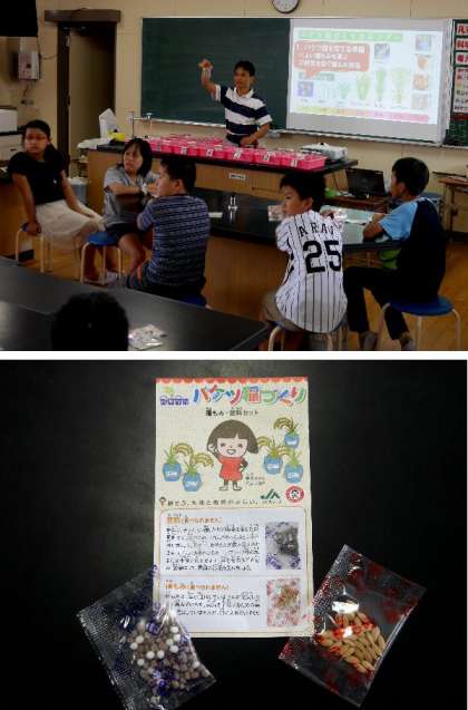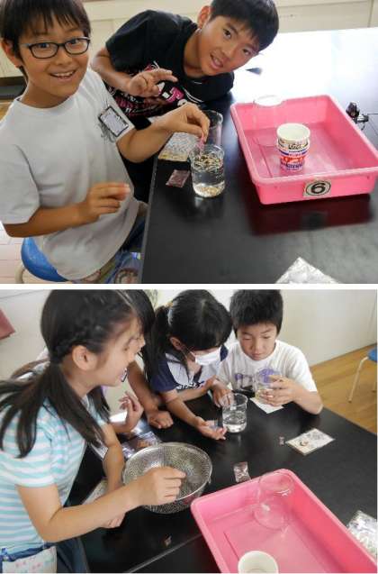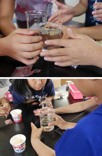 5年生では、種もみからバケツで稲を育てます。まずは、よい種もみを選ぶ作業をしました。塩水に種もみを入れて沈んだ種もみが良い種もみです。これから種をまき発芽をさせて、バケツに土を入れて苗植えをして育てていきます。