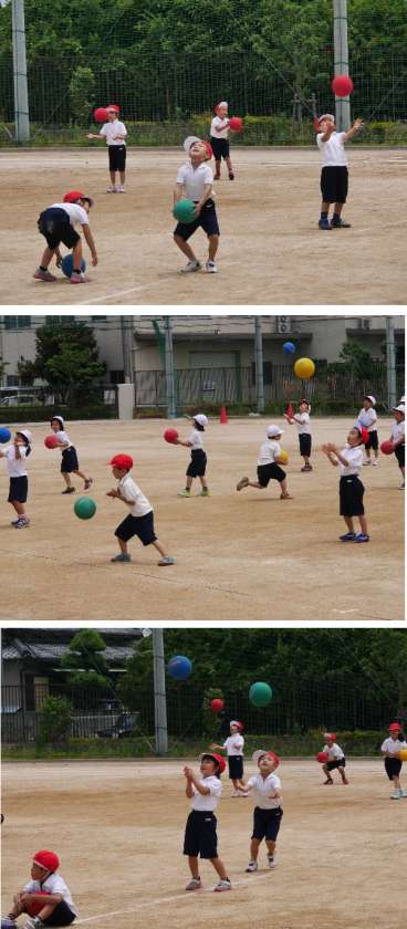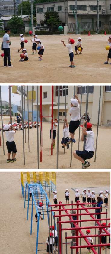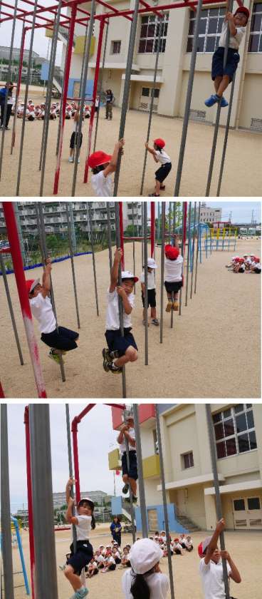 1年生の体育の授業です。のぼり棒を上る練習をしたり、ボールを使って投げてキャッチする練習をしていました。