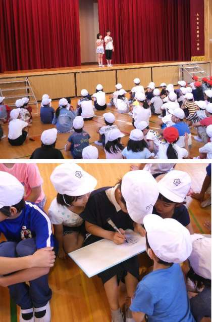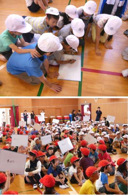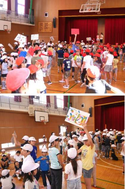 今日の児童集会は、カーテンの間を通ったものをあてるクイズです。黄帽子やランドセル、椅子、先生も宙返りして通りました。たてわり班でホワイトボードで答えます。