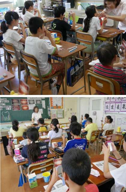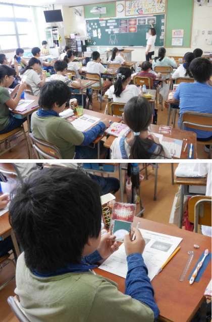 6年生に、教育委員会からきていただき、歯と口の健康教室が行われました。はぐきの状態をカガミで見て確認しました。