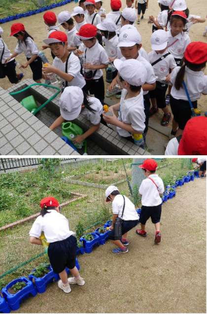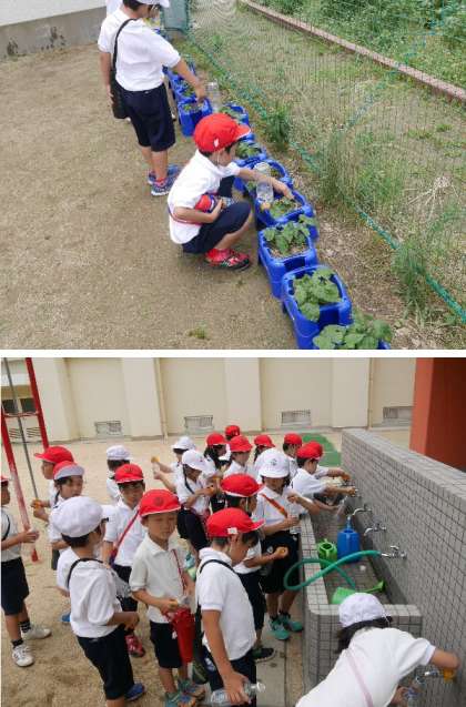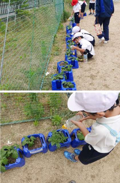 1年生がアサガオに水をやっています。毎日毎日水やりをがんばっていますね。あおあおとした葉っぱが生長してきましたね。