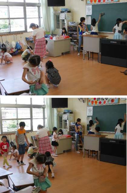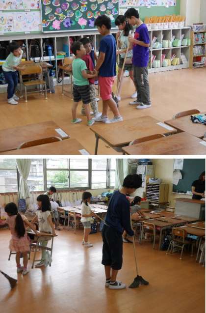 1年生の昼食後の清掃時間には、6年生が助けにきてくれます。とても助かります。たてわり班で仲良くなっているので、6年生はやさしく1年生にも教えてくれています。