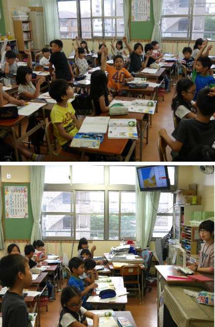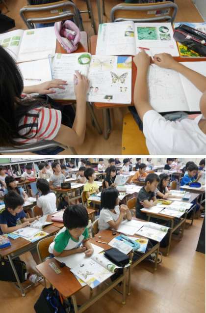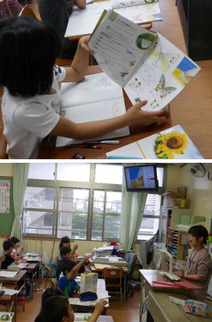 3年生の理科では、チョウの体のつくりについて学習していました。子どもたちはとても意欲的に発表しています。