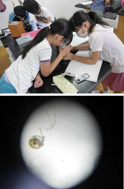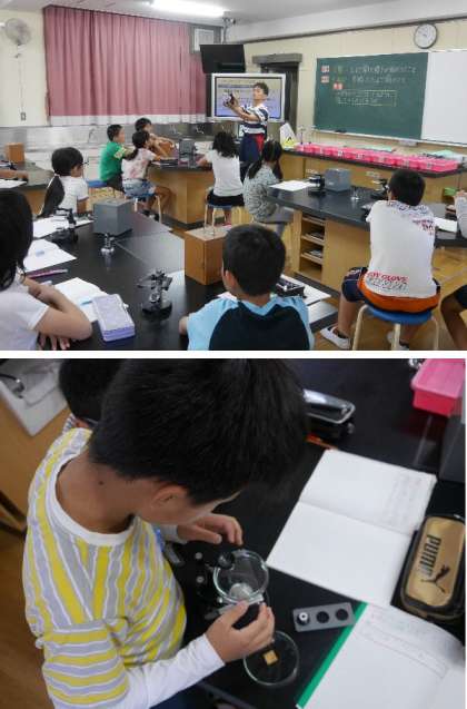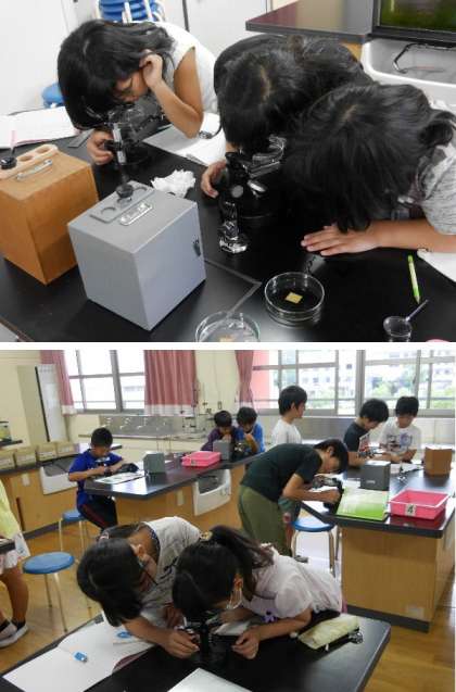 5年生の理科の授業です。顕微鏡で、メダカの卵を観察していました。観察する卵が何日目なのかを、資料と見比べて観察していました。