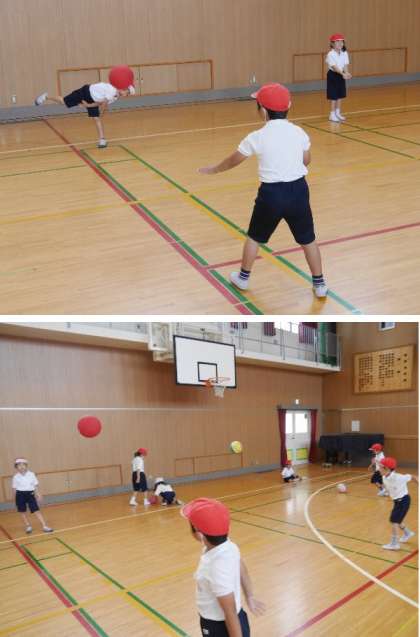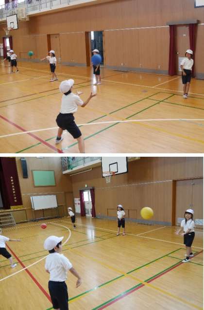 2年生が体育館でボールなげの練習をペアになってしています。相手がとりやすいようにやさしく投げることが大切ですね。手と足、腕のタイミングが少しむずかしいね。