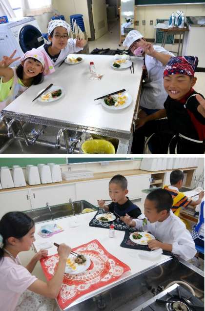 5年生の調理実習がありました。ゆで卵づくりと、ホウレン草を湯がきました。きれいに切ってもりつけて、しょうゆをかけていただきました。できたてはとてもおいしいですね。