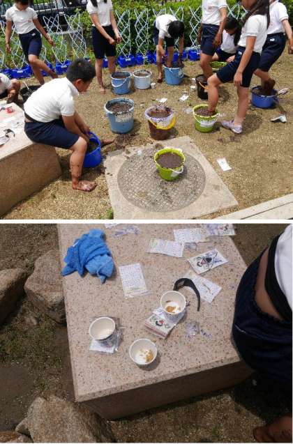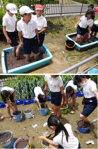 5年生が、教室で育てている種もみをバケツに植え付けました。
