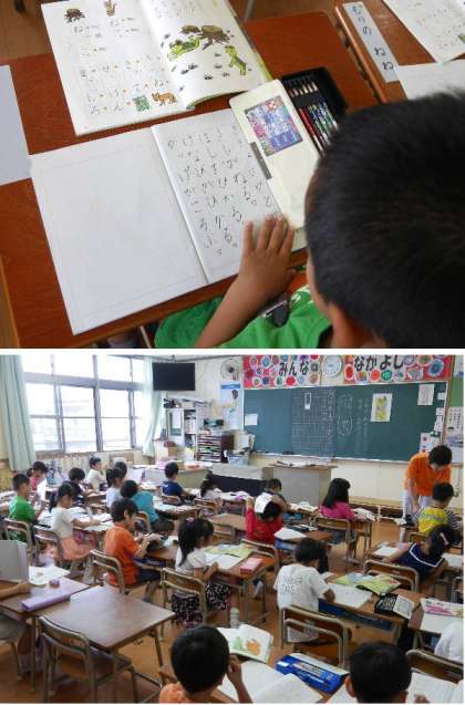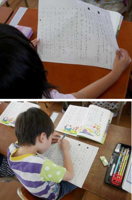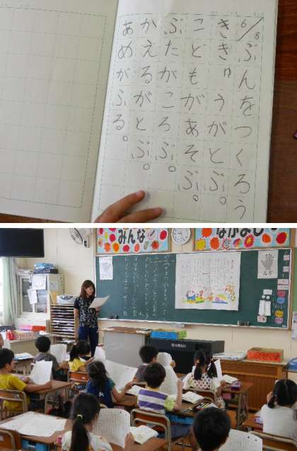 1年生の国語の授業では、いろいろなことばをつないで文を作る学習をしています。作った文を皆の前で発表もしていました。「あひるのあくび」では、あいうえの頭文字をつかった言葉を作っていました。リズムがあってとても楽しい文ができていました。
