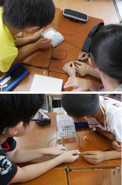 4年生が、検流計をつかって電気回路に流れる電気を測っています。目盛の読み方は少しむずかしいかな?