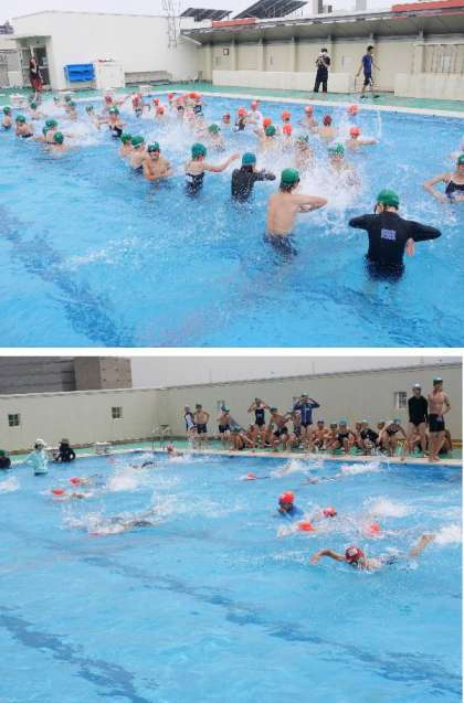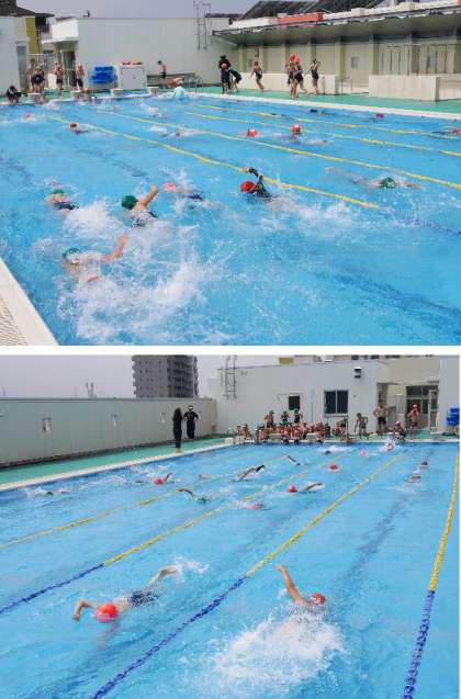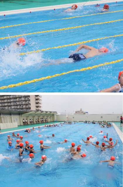 5・6年のプールは2時間目にありました。高学年ですから、水にに慣れたら、どんどん泳ぎだします。50m、25mとそれぞれの習熟に分かれて、それぞれの担当の先生に教えてもらって泳いでいます。