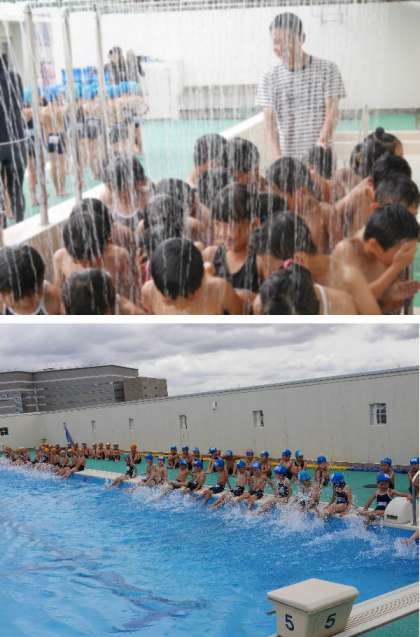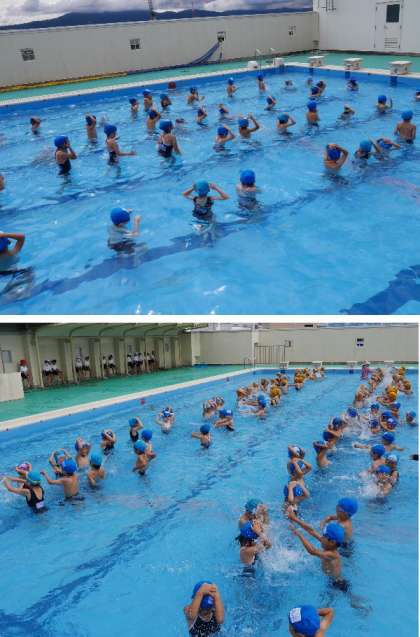 1・2年生のプールがありました。昨夜のどゃぶりの雨から一転して、朝にはいい天気となりました。シャワーをしっかりあびて、水の中でわぁーともりあがっていました。