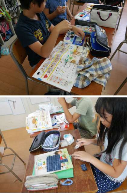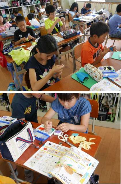 5年生では、ナップザックをつくるために裁縫が始まりました。慣れない手つきで裁縫道具を出して、玉結びや玉どめの練習をしています。だいじょうぶかな?