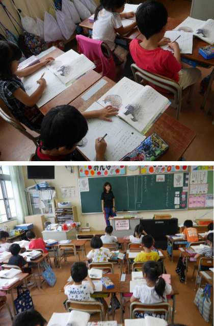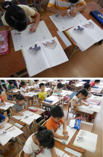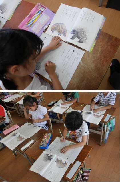 1年生の国語です。「どうやって みをまもるのかな」では、やまあらしや、あるまじろなどの動物がどうやって身を守っているのが書かれています。文章を読んでその答えを探して書き込んでいます。少しずつ長い文章を読んでいく力をつけていっています。いろんな本を読んで力をつけていきましょうね。