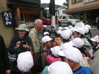 学校で集合して出発です。地下鉄の鶴見緑地駅から京橋駅、京阪で京橋駅から清水五条駅まで特急でいきました。清水寺へ向かう参道で外国の観光客にも出会いました。英語で挨拶して交流もできました。