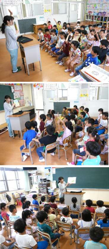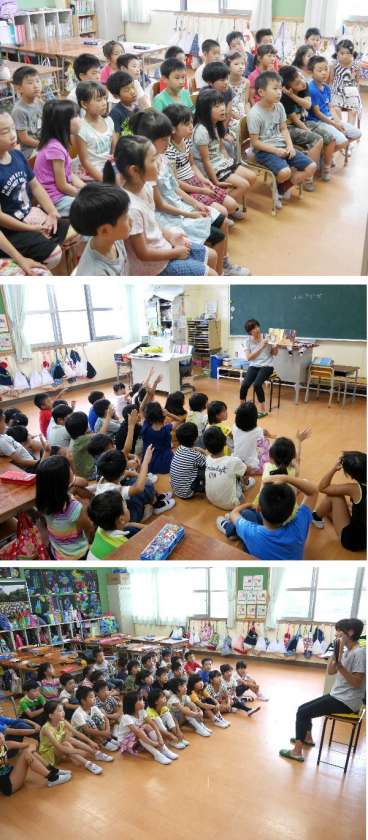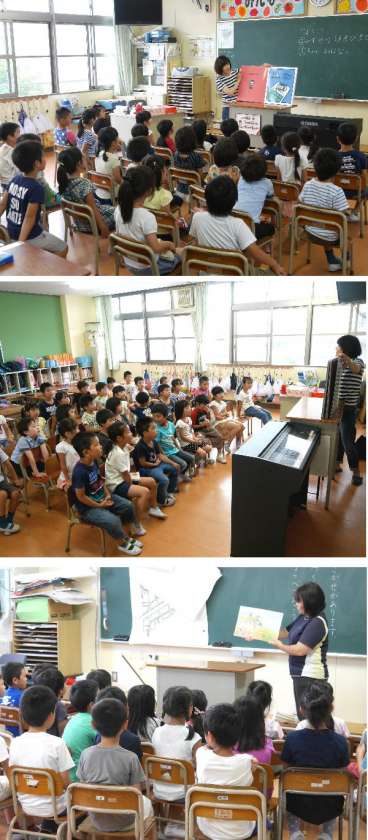 図書ボランティアさんによる読み聞かせをしていただきました。子どもたちは、きれいな絵本とボランティアさんのお話しに、ときおり歓声もあがります。