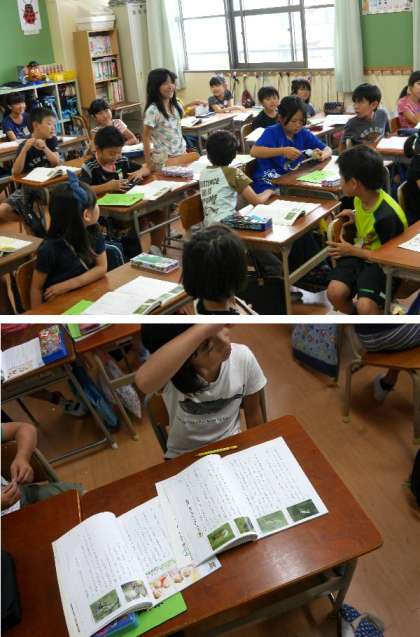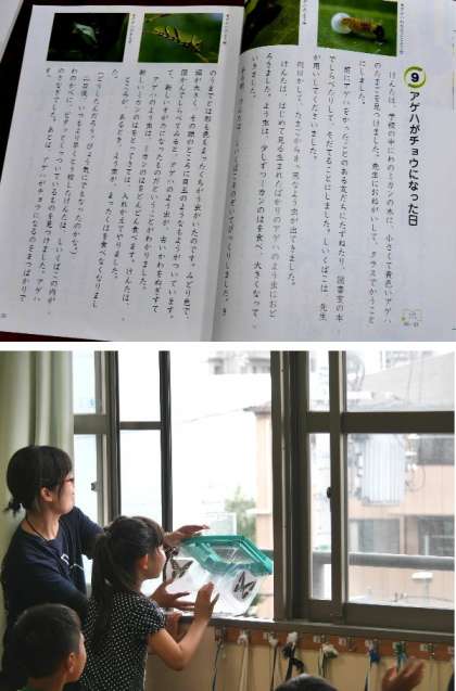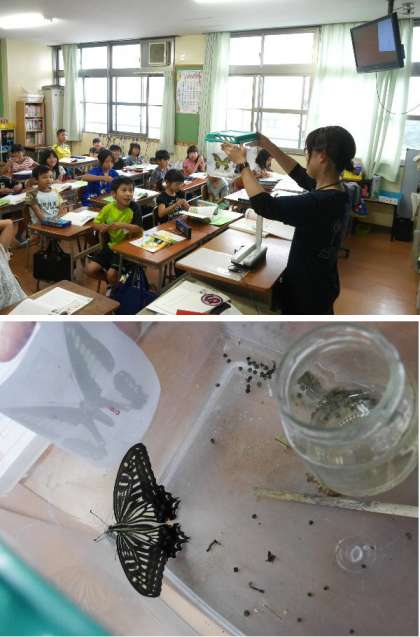 アゲハチョウの幼虫をいただいて、3年生で育てていましたが、とうとうアゲハチョウになりました。このアゲハをはなしてあげるかどうかを学級で話し合っています。ちょうど、道徳の本に「アゲハがチョウになる日」という読み物があります。これを読みながら、皆で意見を出しました。結局、アゲハをはなしてあげることになりました。さびしいけれど、自由に羽ばたいてほしいですね。
