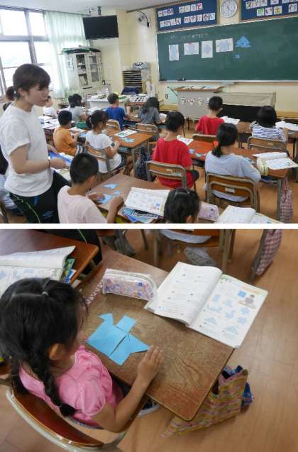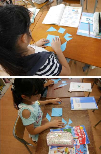 3年生の算数の時間です。教科書にある形を切り抜いて、切り取った図形を全部使って、いろいろな形を作っています。煙突がある家はとてもむずかしいですね。どう組み合わせたらできるかを考えています。