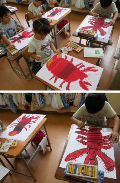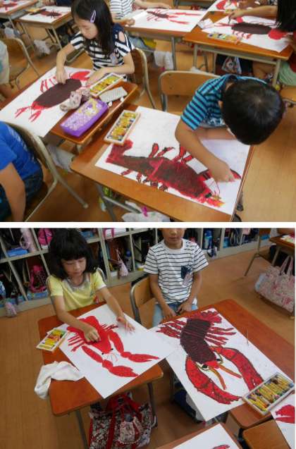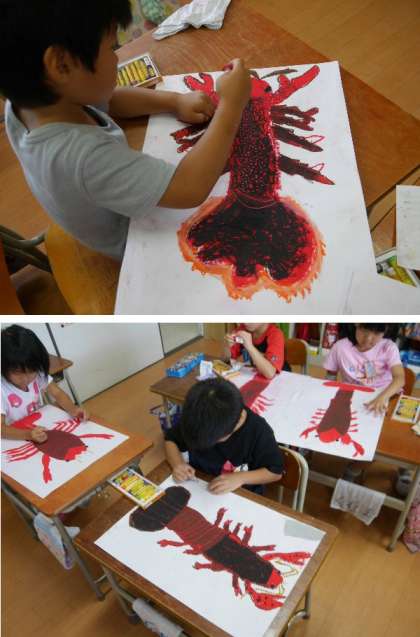 2年生がとても上手にザリガニの絵をクレパスで描いています。一度ぬって、竹串でひっかいたりしていい感じにしあがってきました。