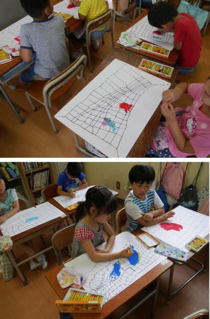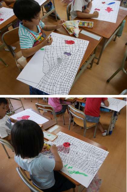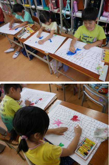 1年生は先日、一筆で網の絵を描く練習をしました。今日は網の絵の中に、おさかなの絵を描きいれていました。いろんな生き物がはいっていますね。