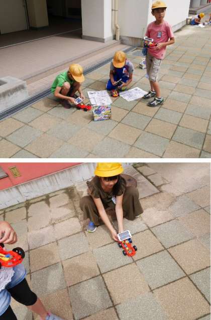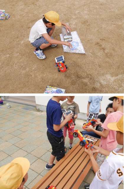 4年生の理科では、電気の学習をしながら、ソーラーカーを作っています。太陽光電池をとりつけて動かしています。今日は少し太陽のパワーが少ないかな。