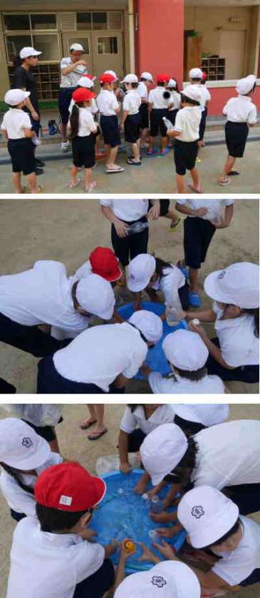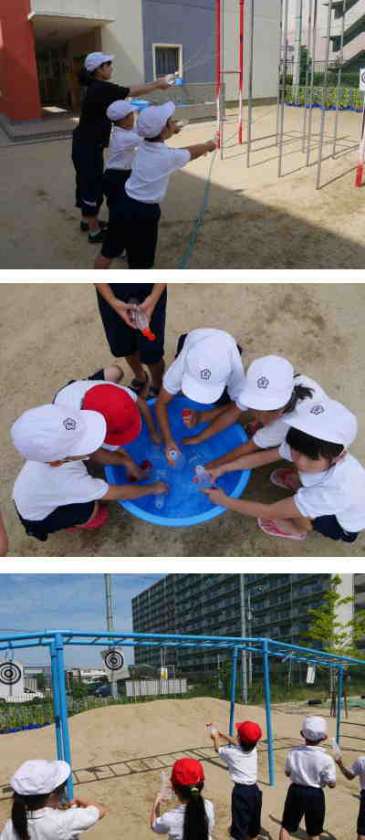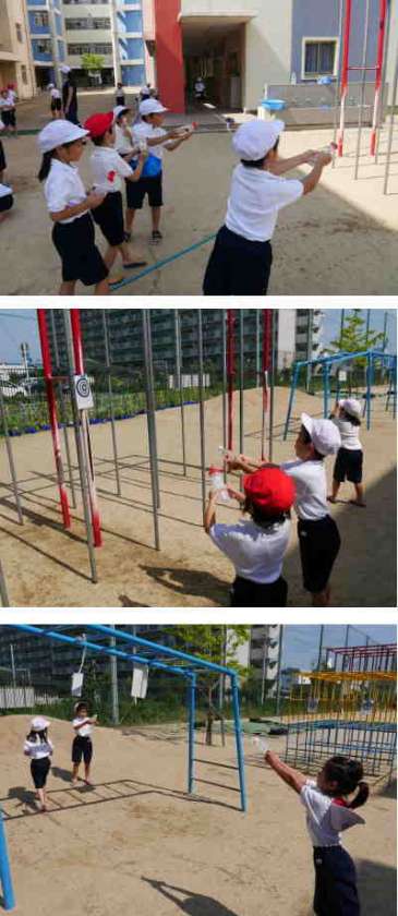 朝から気温がぐんぐん上がる中、1年生が生活科の学習で水あそびをしました。タライの水を用意したペットボトルやマヨネーズの容器に入れ、遊具に吊り下げたマトに向かって思いっきり飛ばしました。子どもたちは暑さを吹き飛ばすかのように、歓声を上げながら元気に活動しました。